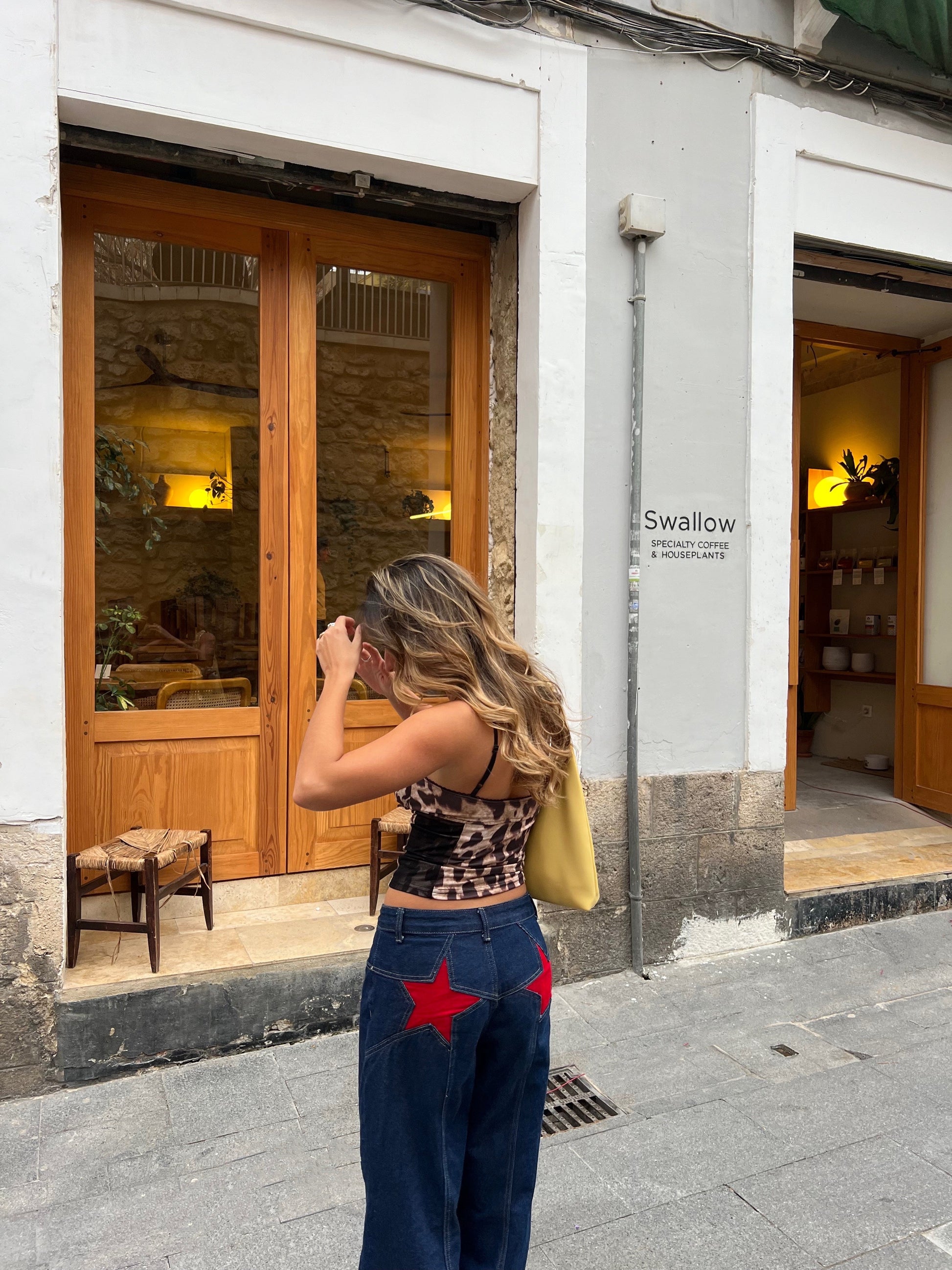 The coolest jeans with red stars on the back. The jeans have a loose and straight fit and a mid-waist. They have belt loops and a zipper and button closure.