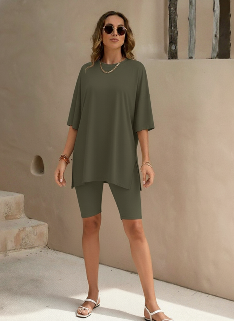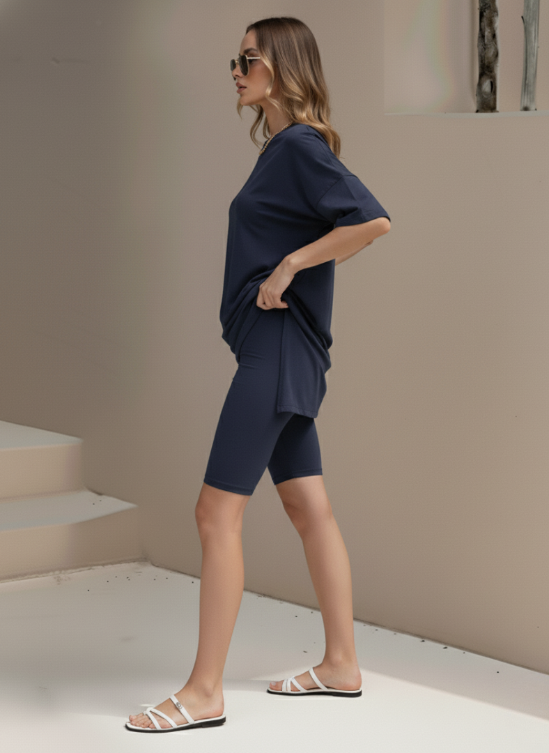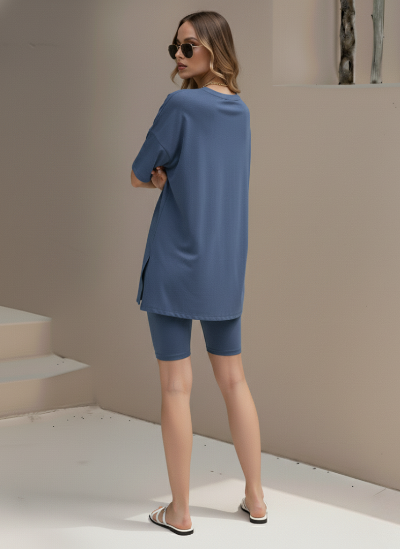 Embrace comfort and style with this oversized lounge set. Ideal for lounging at home, running errands, or casual outings, this set offers versatility and ease. Pair the high-low tunic top with the matching biker shorts for a coordinated look, or mix and match with other pieces in your wardrobe to create personalized outfits. The breathable fabric ensures you stay comfortable throughout the day.